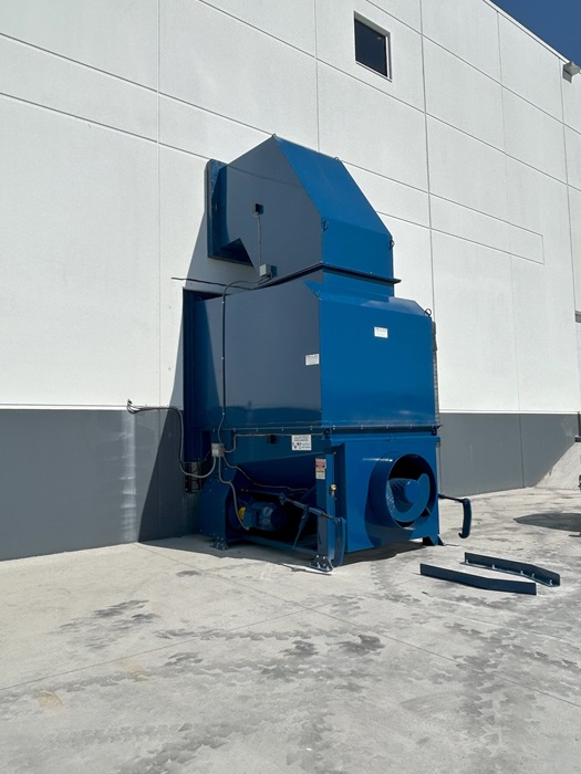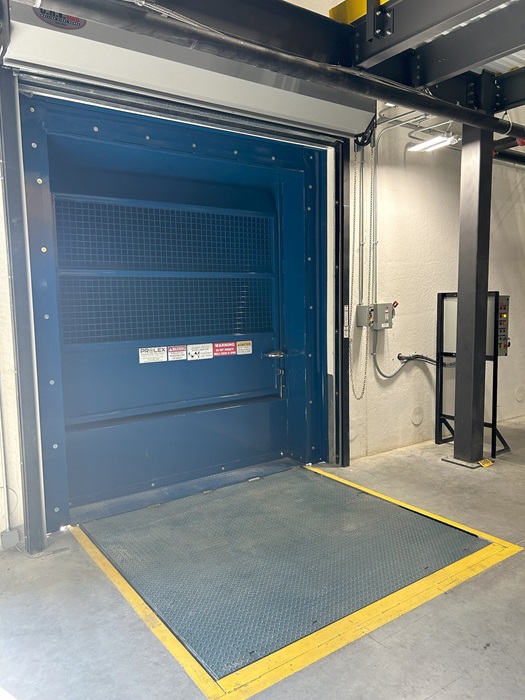 ST4060/40 compactor with a custom engineered dock door enclosure to accommodate an overhead conveyor system for cardboard. This compactor was built with a compactor mounted ram-style bin adapter so it can be used with any standard compaction bin.